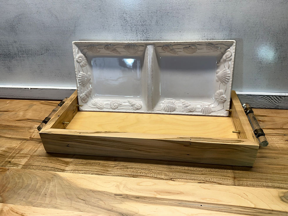 Handcrafted Ambrosia Maple Appetizer Tray with Divided Seashell Ceramic Dish